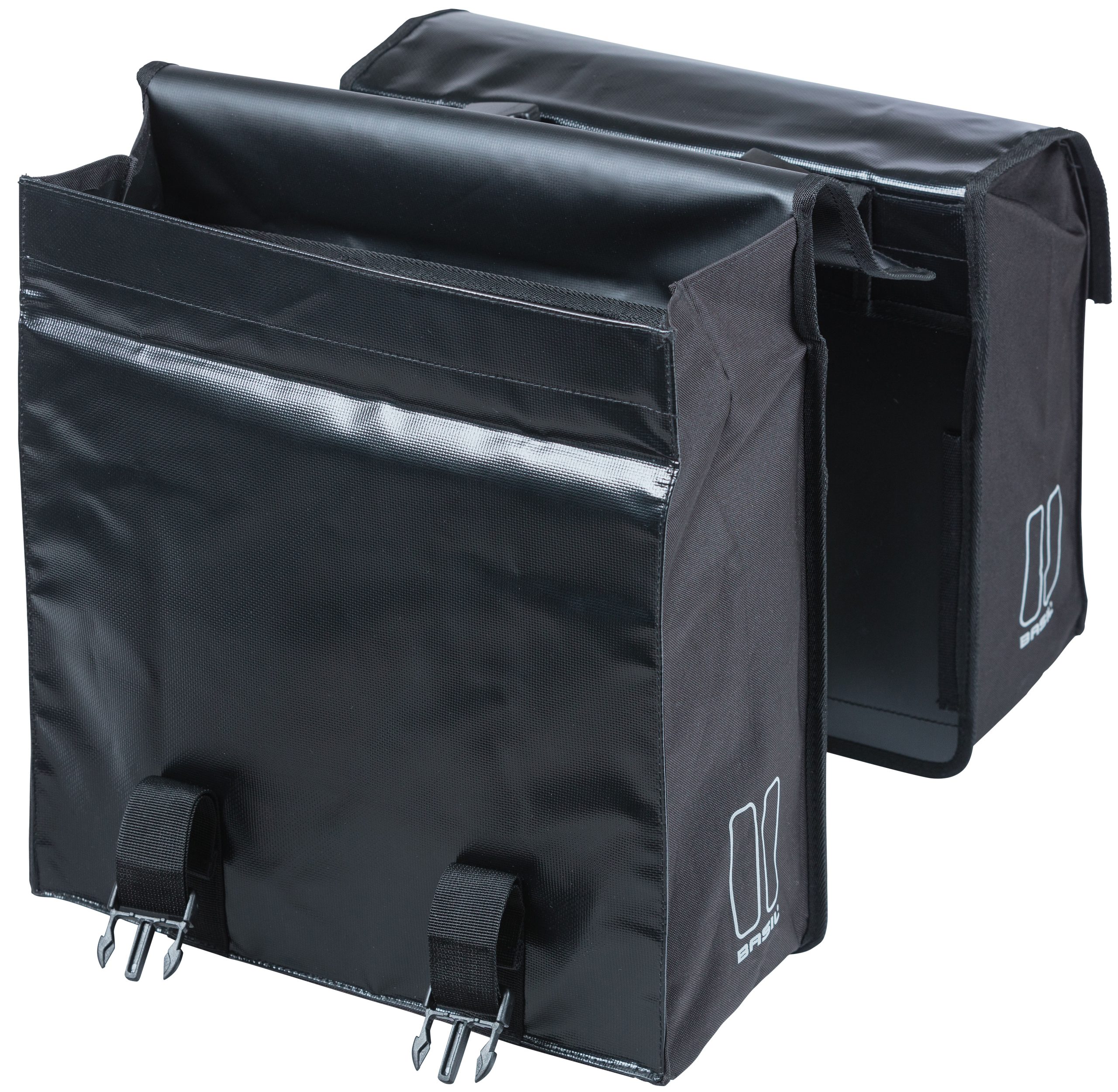 De Basil Urban load dubbele fietstas is een moderne fietstas voor de echte stadsmensen onder ons. Deze tas is ruim, georganiseerd, flexibel en heeft een strakke uitstraling. Door het waterafstotende tarpaulin kan de tas wel tegen een regenbuitje. Ook de vouwsluiting is waterkerend en voorkomt inregenen. Weer of geen weer, jij stapt op de fiets, of het nu naar kantoor, de supermarkt of de sportschool is! De ruime fietstas heeft een inhoud tot wel 53 liter. Je kunt de tas door de verstelbare kliksluiting naar gewenste hoogte inpakken en sluiten. Hier kun je dus heel wat boodschappen, sportkleren of andere benodigdheden in kwijt. Als de tas leeg is, is die compacter of smaller te maken door de flexibele zijkanten. Zo is het parkeren van je fiets bij die overvolle fietsenstalling een stuk gemakkelijker. Je bevestigt de Basil Urban Load fietstas eenvoudig met het MIK systeem. De tas is voorzien van een voorgemonteerde MIK adapterplaat en is daarmee geschikt voor een MIK systeemdrager. Heb je geen MIK bagagedrager op je (elektrische) fiets? Monteer dan de MIK Carrierplaat op je bagagedrager. Heb je veel en zwaardere spullen in je tas? Dan kun je de tas combineren met de Basil Afstandhouder (apart verkrijgbaar). Deze houder voorkomt dat de tas in de spaken van je fiets komt. Eigenschappen:
