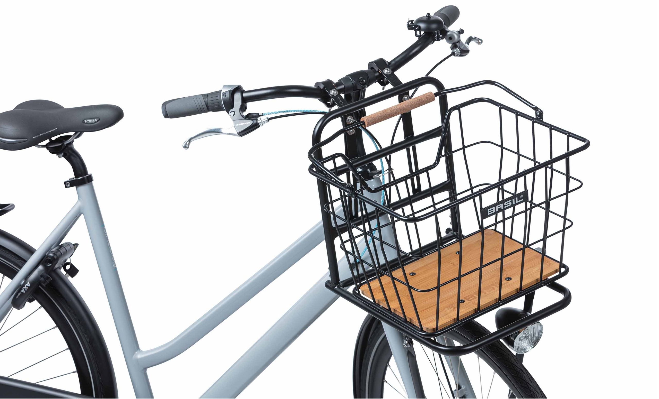 De Basil Nordland MIK is een fraaie fietsmand, verkrijgbaar in de kleur zwart met een bamboe-bodem. Je monteert de mand voor- of achterop met de meegeleverde MIK-adapterplaat. Ben je op zoek naar een moderne fietsmand? Dan is de Basil Nordland MIK fietsmand iets voor jou! De afneembare mand is gemaakt van een robuust staal in combinatie met een bamboe bodem. Met een inhoud van 23 liter is de mand ideaal voor het doen van je dagelijkse boodschappen. Zo komt de mand van pas bij je wekelijkse bezoek aan de markt. Daarnaast kun je er gemakkelijk je handtas in kwijt. Je bevestigt de mand eenvoudig dankzij de voorgemonteerde MIK-adapterplaat. Met deze adapterplaat klik je de mand eenvoudig in jouw bagagedrager of voordrager met MIK-profielen of een MIK-bagagedragerplaat. Wil je de mand meenemen de winkel in? Dan klik je de mand er net zo gemakkelijk weer af. De mand neem je comfortabel mee dankzij de handgreep. Deze handgreep is gemaakt van rubber en kurk. De MIK-adapterplaat past op veel bagagedragers, dames-, heren-, en de elektrische fiets. Eigenschappen: